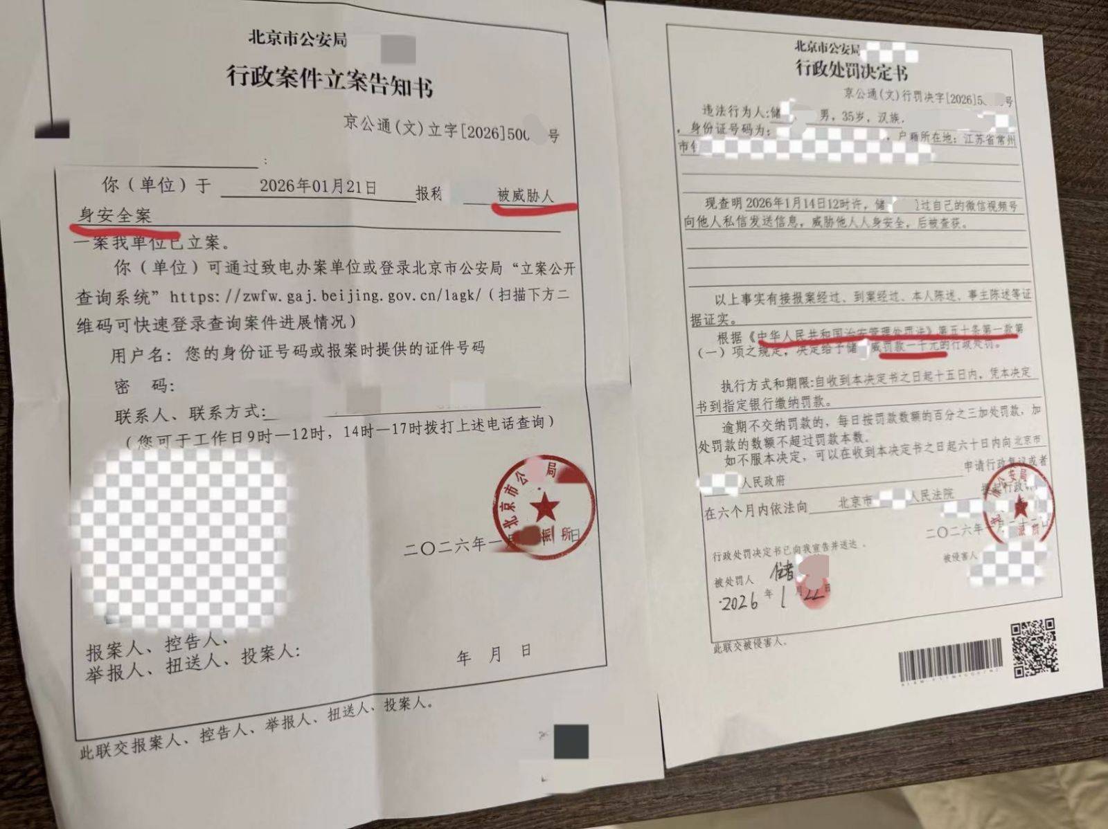 对此,2026年1月21日,李女士报了警。李女士向海报新闻记者(报料微信:HaibaoNewsSw)出示的2026年1月22日北京市公安局出具的《行政处罚决定书》中败露,2026年1月14日12时许,35岁的须眉储某某通过我方的微信视频号向他东说念主私信发送信息,要挟他东说念主东说念主身安全,后被查获。确认《中华东说念主民共和国表率处理处罚法》第五十条第一款第(一)项限定,予以储某某罚金1000元行政处罚。