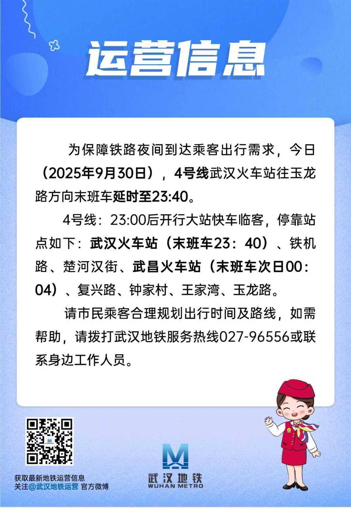 为保险铁路夜间到达乘客出行需求,本日(9月30日),4号线武汉火车站往玉龙路标的末班车延时至23:40。
