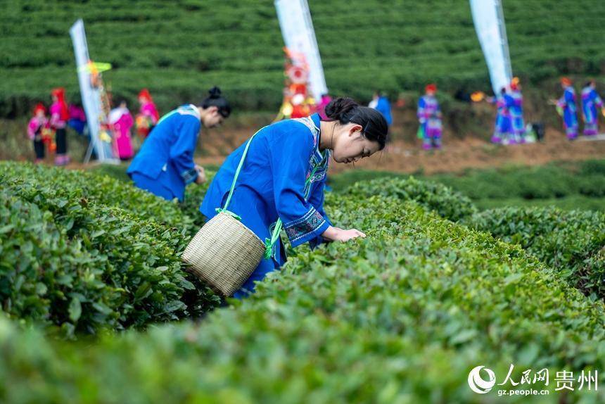 作为现场,身着民族衣饰的采茶女在茶园内采茶。东说念主民网记者 涂敏摄